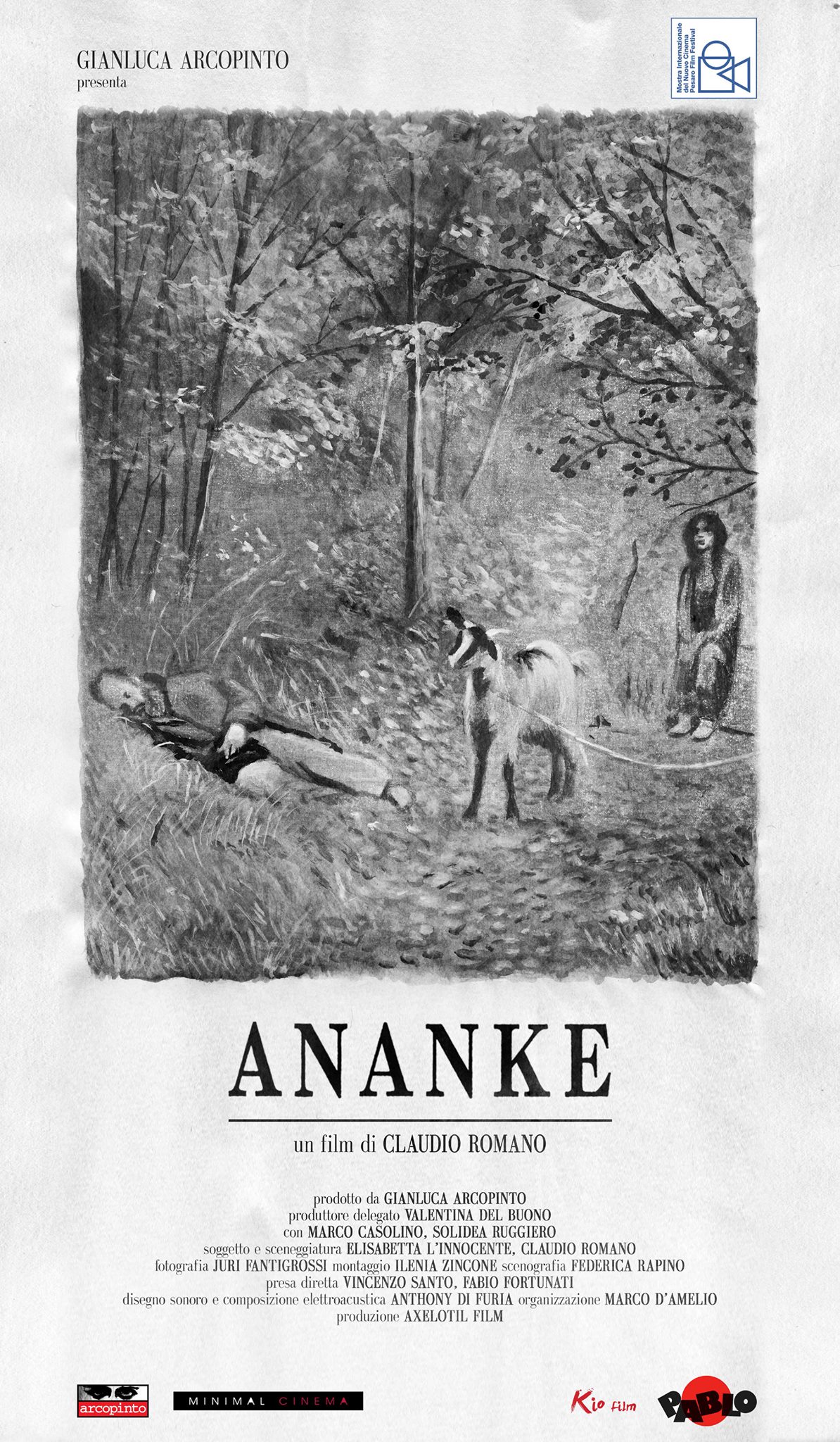 Ananke (2015), è un lungometraggio sceneggiato da Betty L’Innocente, con Marco Casolino e Solidea Ruggiero attori protagonisti. Nelle sue linee nutritive è duro, diretto, circolare e speculare. Un lavoro nel quale un uomo e una donna abbandonano (fuggono) una realtà che li potrebbe uccidere, annientare, nella loro esistenza. Facendosi forza, assieme, aggrappandosi l’uno con l’altra, entrambi, arrivano in un’area non definita di questo mondo, una zona collocata in un contesto dove regna la scomparsa del senso moderno di vita, nel suo concetto ritmico di tempo, in cui la scrittura e una radio dai segnali disturbati rappresentano le uniche costanti esterne per un umano contatto.