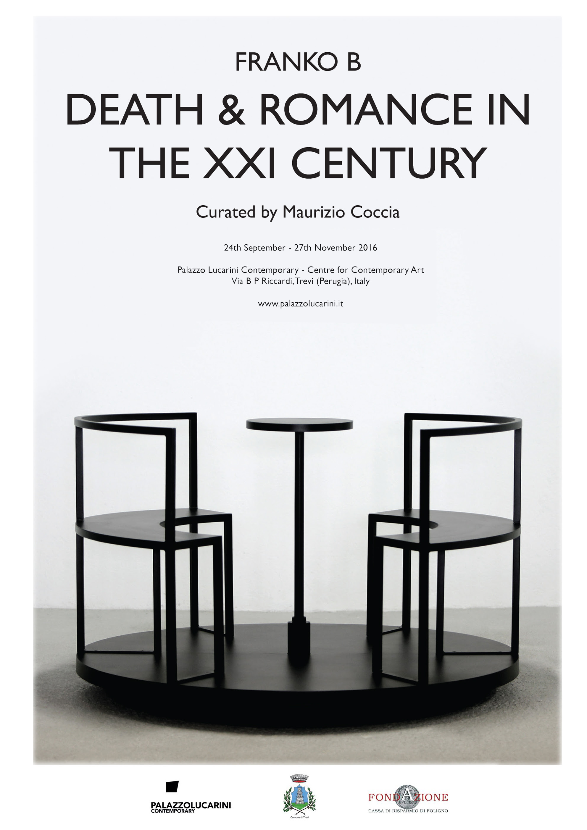 Il 24 settembre 2016 alle ore 19.00 a Palazzo Lucarini sarà inaugurata Death and Romance in the XXI Century, la prima mostra personale di Franko B in uno spazio istituzionale italiano dal 2010. Sarà esposta la sua