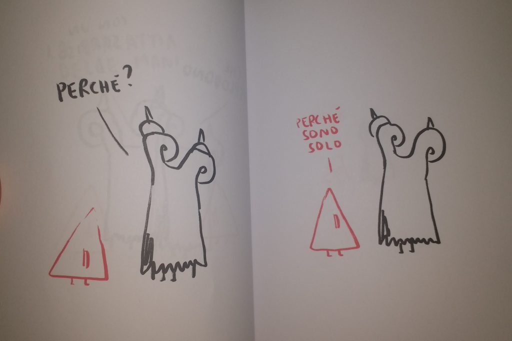 In questo quadro, fatto di fogli, composto da una casa con poche stanze visibili, sono assemblati segni che prendono forma nei colori rosso e nero. Le tonalità più forti sono date dalle onomatopee, le quali rafforzano il senso del suono rendendo le cose vive nella loro libertà di espressione, umili nel traghettarti in un dramma ironico alla ricerca di un equilibrio che si fa necessario non rinnegando una divinità, ma mostrando la potenza nella sua parte più nociva: il male. Una figura, un amico immaginario, un testimone, una introiezione fatta paura in una solitudine che ci accompagna nella esistenza, per l’esistenza.