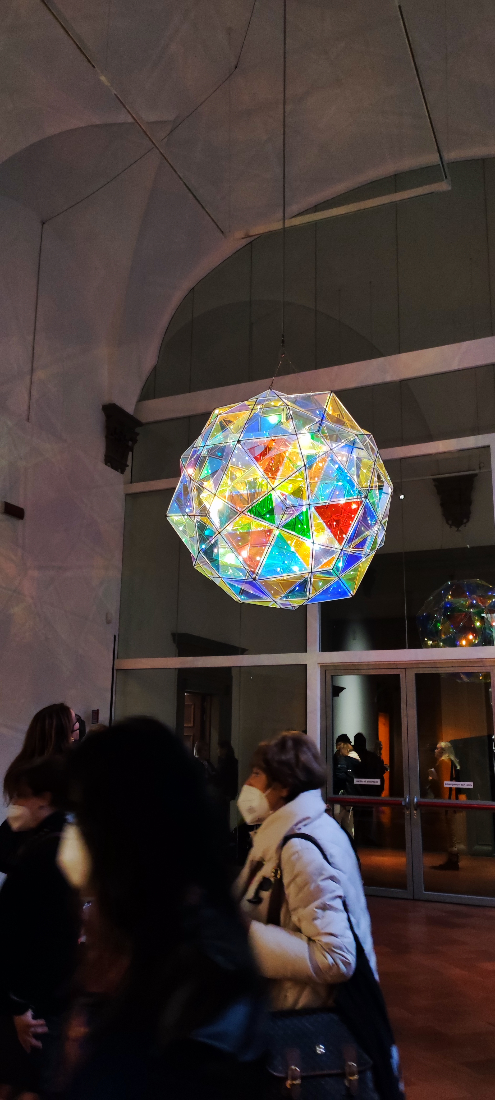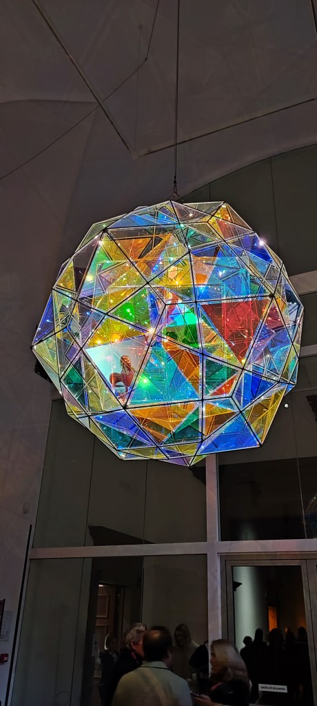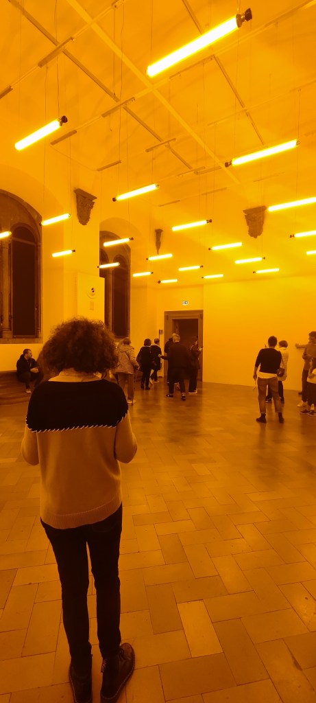 Nel tuo tempo allora è pura illusione, sbilanciamento e costruzione, sembra di essere in una mega dimensione di epoca moderna dove il colore sfruttato dagli artisti rivestiva di piena luce le statue dei santi in figure che condizionavano le interpretazioni di chi, senza istruzione, si apprestava a vivere le vicende narrate dalle autorità religiose attraverso l’uso sapiente della voce e nella cultura orale. Allora il punto è qui: a Firenze, Eliasson, ci sta dicendo che siamo noi il visivo? siamo noi quelle pitture e quelle sculture che riempivano i luoghi del sacro da rimodellare per esprime quella voce dall’alto? Ma qual è quella voce che non si identifica?
