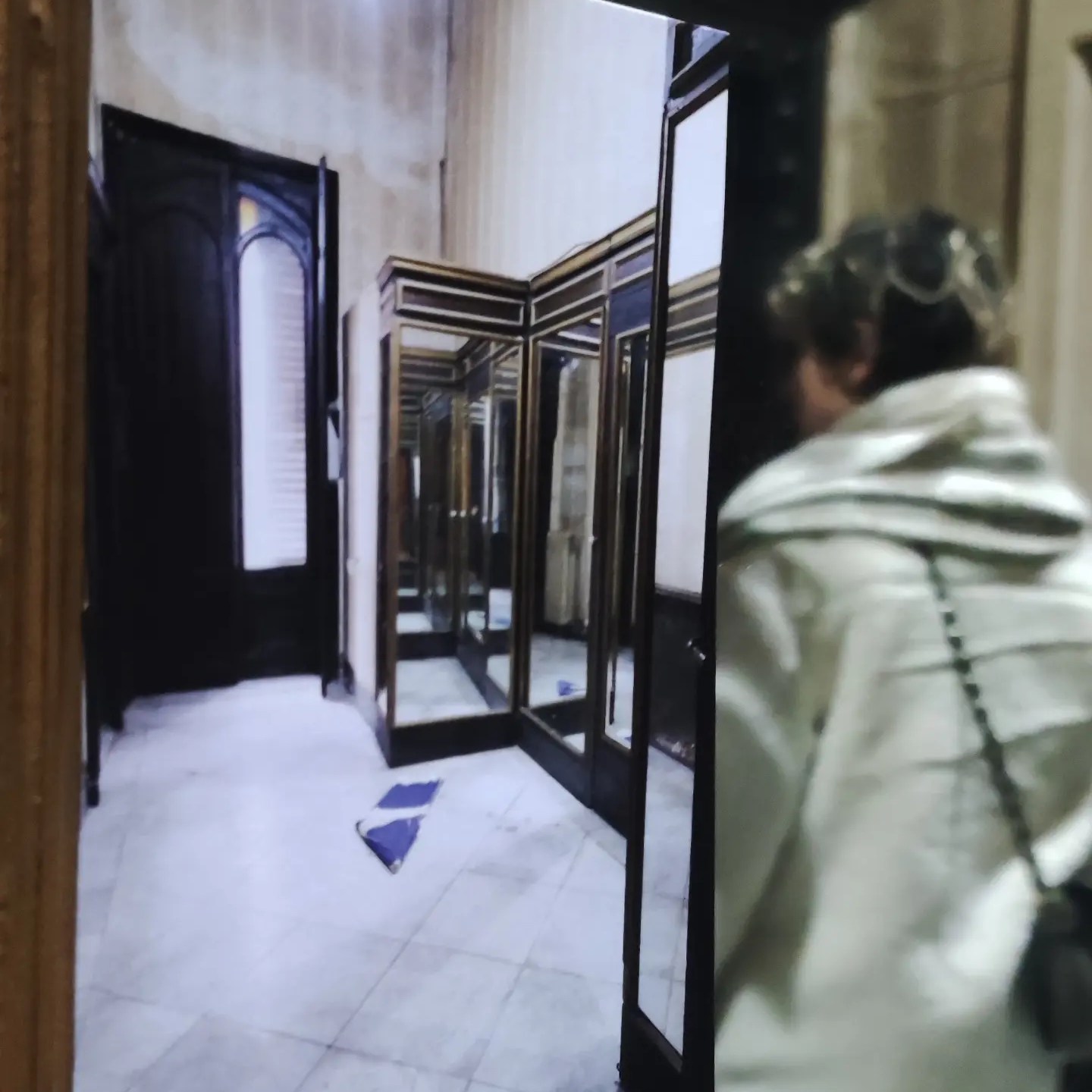 Nella sede del palazzo, la bandiera/ombrellone, è stata piegata e posizionata con una logica istituzionale e rituale, poggiata su un calorifero; il visitatore, al contrario, messo a contrasto con la propria immagine ed esposto in una stanza piena di specchi sui cui si poteva osservare la pratica di piegatura in ogni singolo passaggio eseguito dall’artista per custodire il drappo.