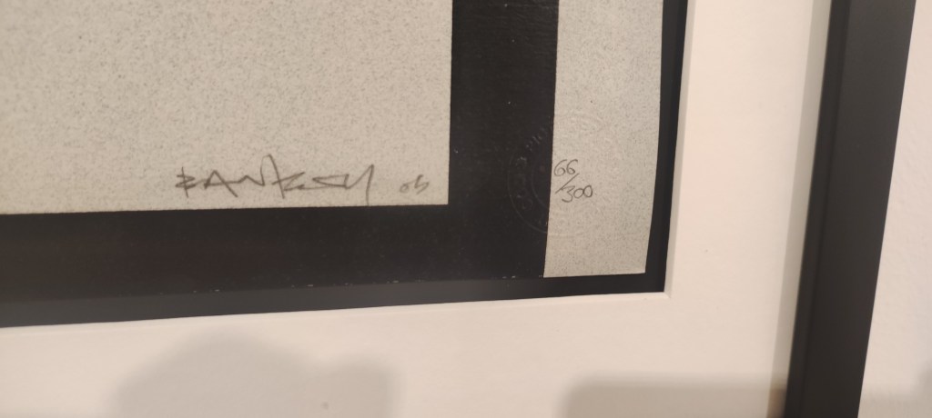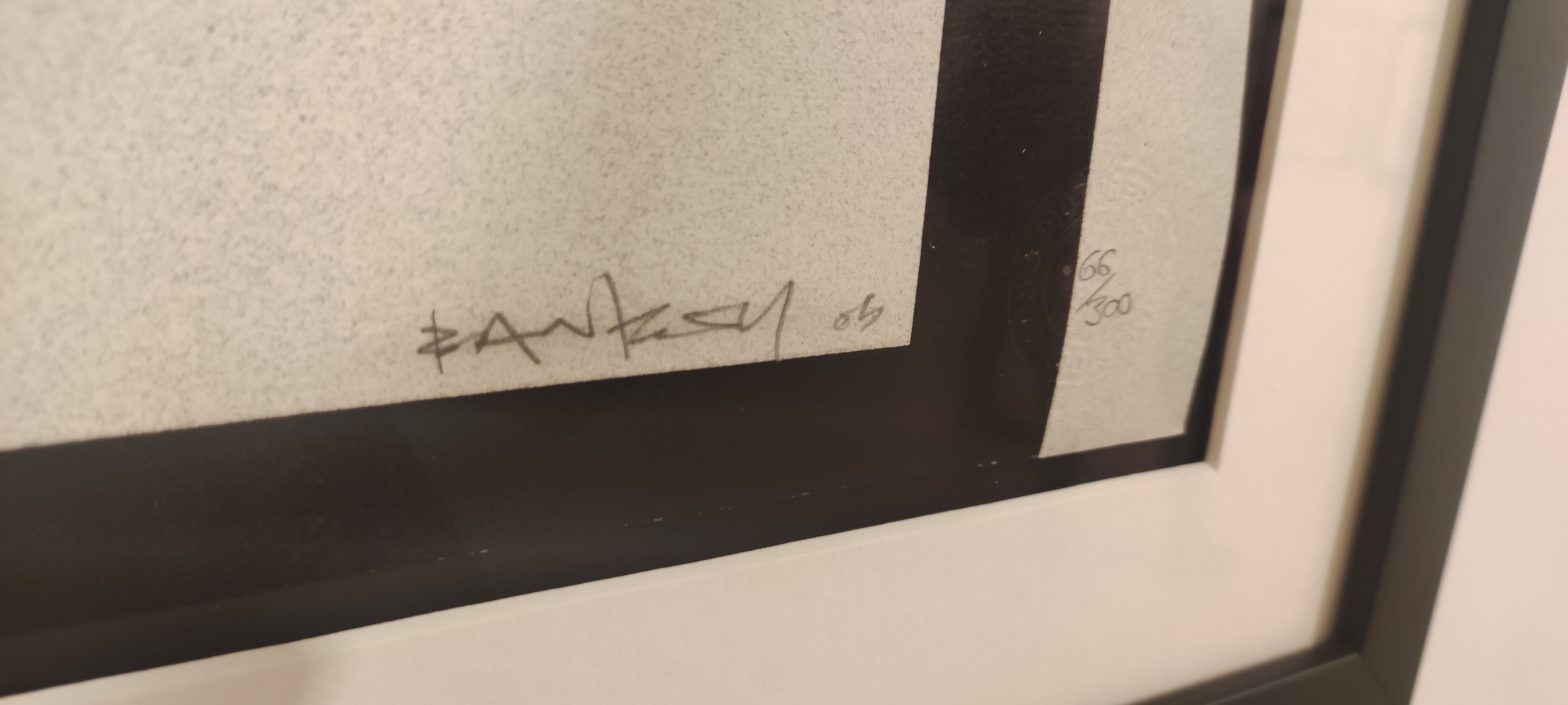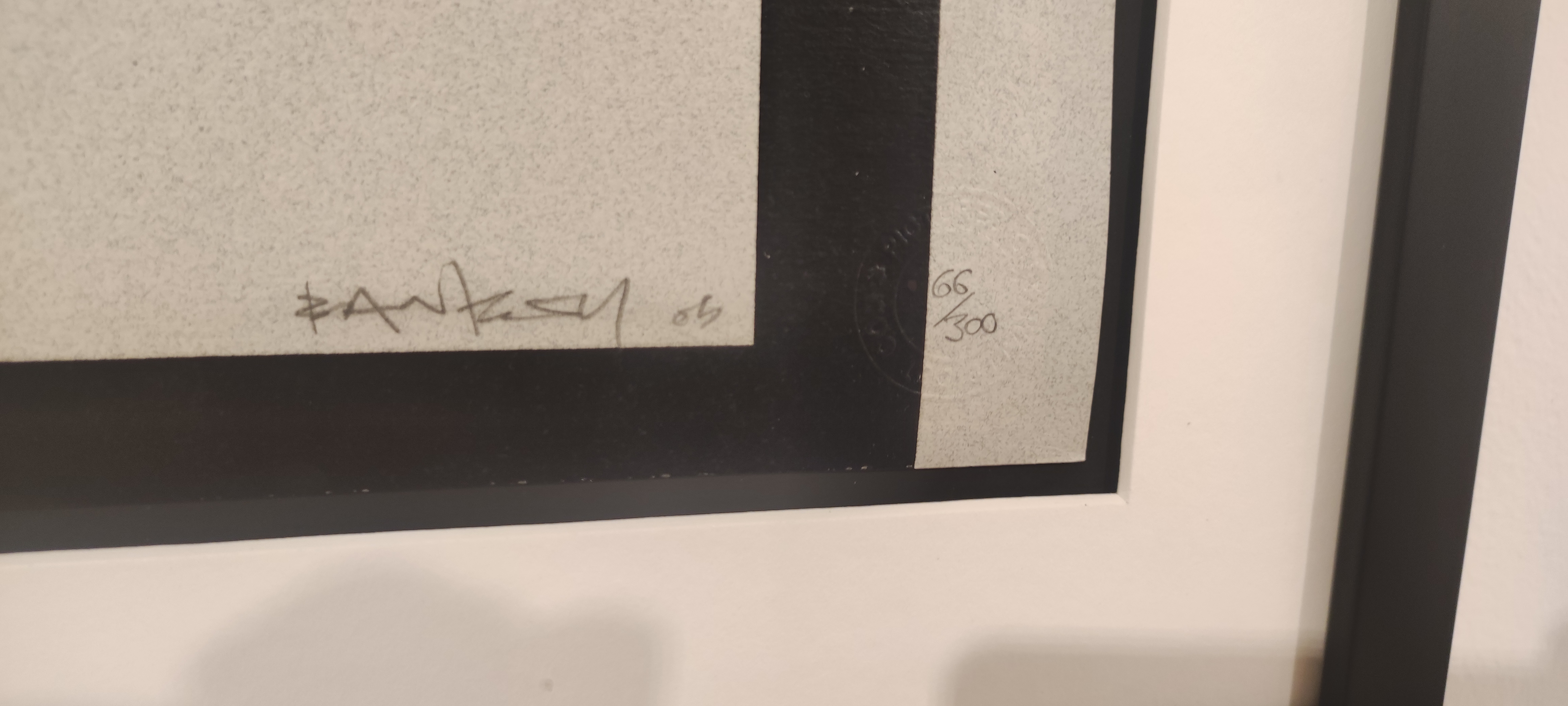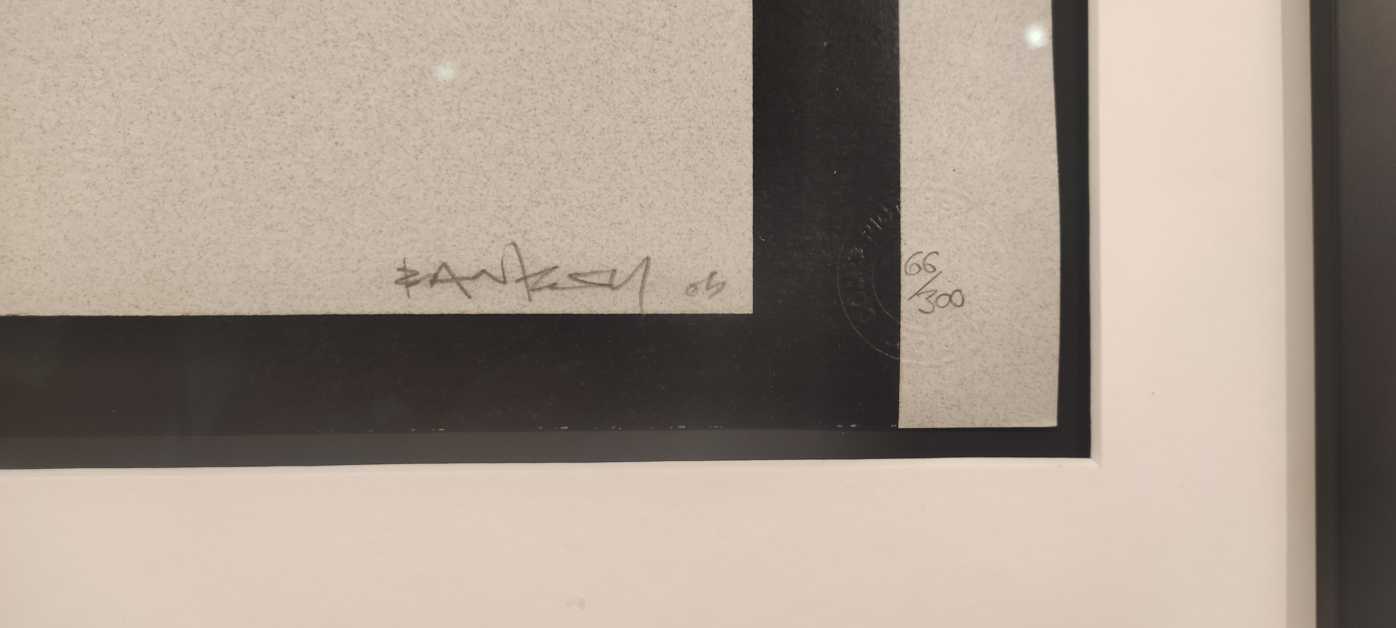 Utile è anche notare come molti dei pezzi esposti siano dei multipli, cioè non un’opera unica ed esclusiva, ma qualcosa che ha elementi di un’arte furba, pensata per essere rappresentata in più esemplari e di solito venduta a prezzi più contenuti. Un esempio è “Girl with Balloon” – il lavoro con la ragazzina del palloncino rosso – che si ha in mostra con la serigrafia numero 460 di 600 pezzi prodotti. Nel lavoro esiste un marchio, ma è invisibile la firma di Banksy nella sua parte frontale. La didascalia presenta la spiegazione del lavoro, le vicissitudini legate al pezzo originale, addirittura i nomi propri di due persone che sarebbero potute rimanere in anonimato con la classica dicitura “Collezione privata”. Caso contrario è in “Grin Reaper” (Tristo mietitore, 2003), in origine pensato come stencil, cancellato in una campagna anti-graffiti avviata dal comune di Londra nel 2005 è una serigrafia che presenta una firma e ha un marchio visibile.