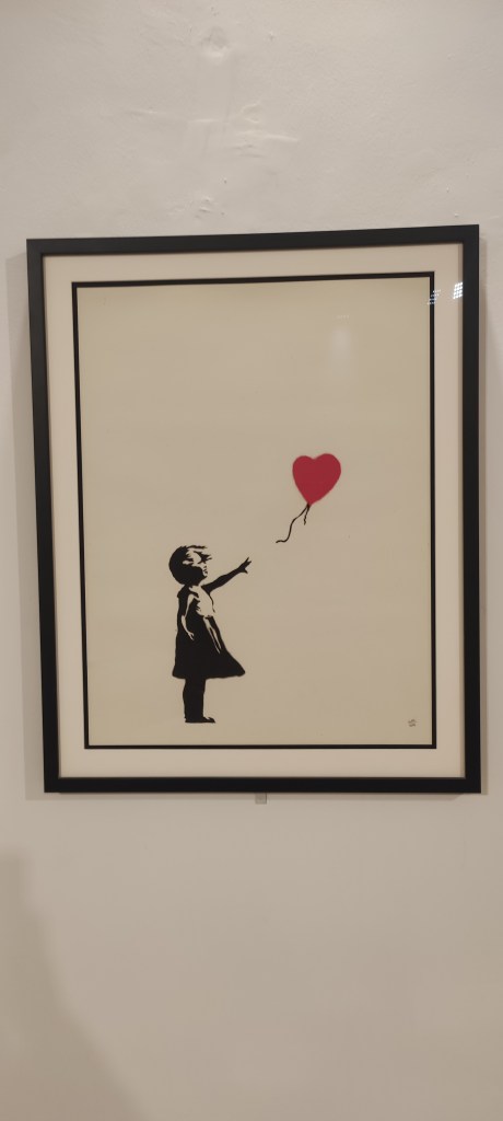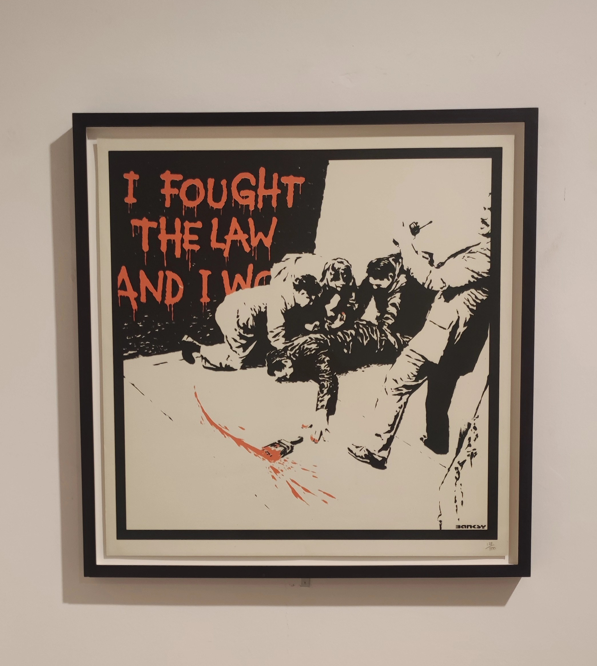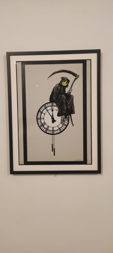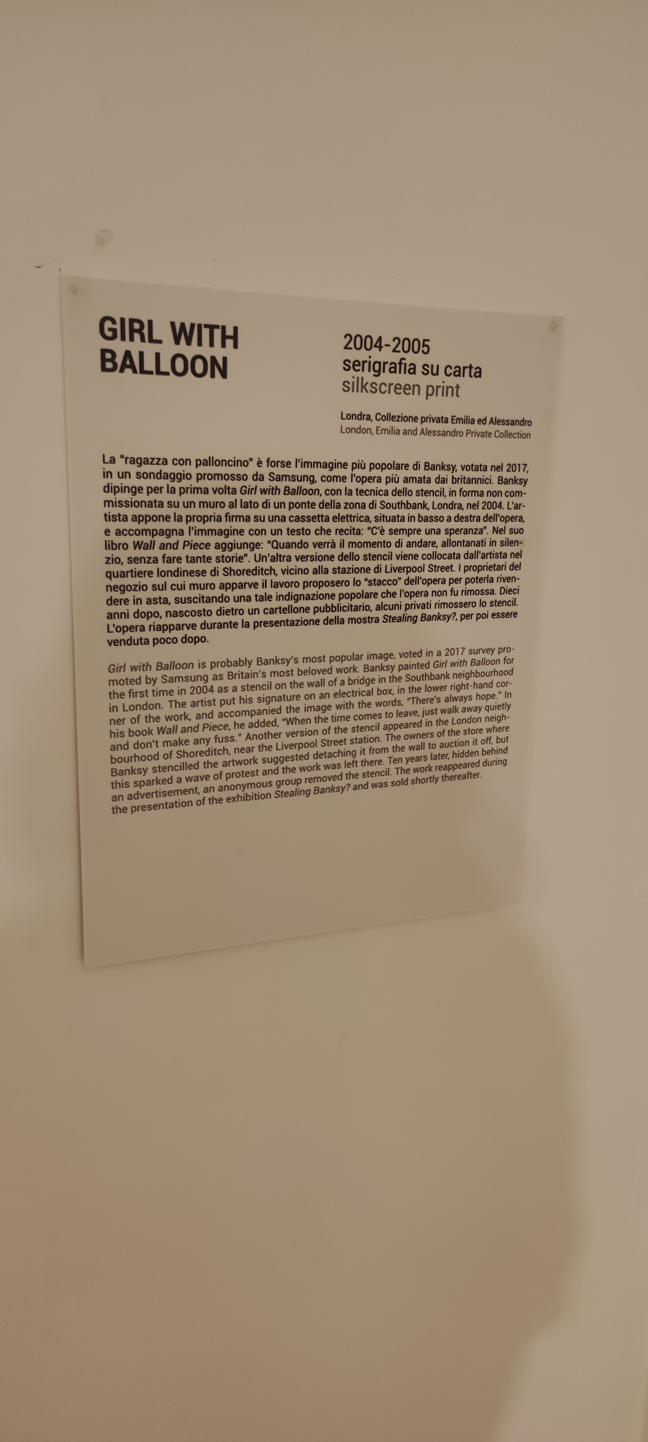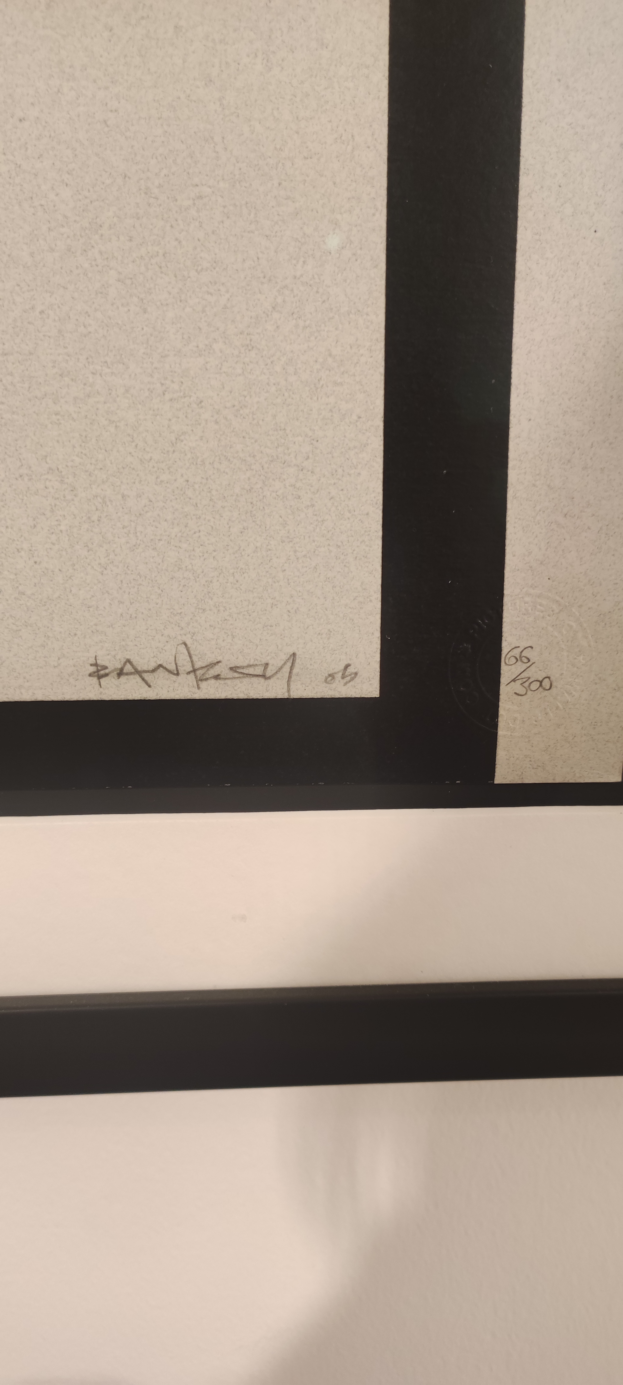 Utile è anche notare come molti dei pezzi esposti siano dei multipli, cioè non un’opera unica ed esclusiva, ma qualcosa che ha elementi di un’arte furba, pensata per essere rappresentata in più esemplari e di solito venduta a prezzi più contenuti. Un esempio è “Girl with Balloon” – il lavoro con la ragazzina del palloncino rosso – che si ha in mostra con la serigrafia numero 460 di 600 pezzi prodotti. Nel lavoro esiste un marchio, ma è invisibile la firma di Banksy nella sua parte frontale. La didascalia presenta la spiegazione del lavoro, le vicissitudini legate al pezzo originale, addirittura i nomi propri di due persone che sarebbero potute rimanere in anonimato con la classica dicitura “Collezione privata”. Caso contrario è in “Grin Reaper” (Tristo mietitore, 2003), in origine pensato come stencil, cancellato in una campagna anti-graffiti avviata dal comune di Londra nel 2005 è una serigrafia che presenta una firma e ha un marchio visibile.