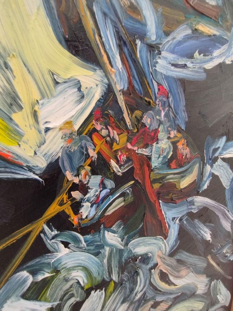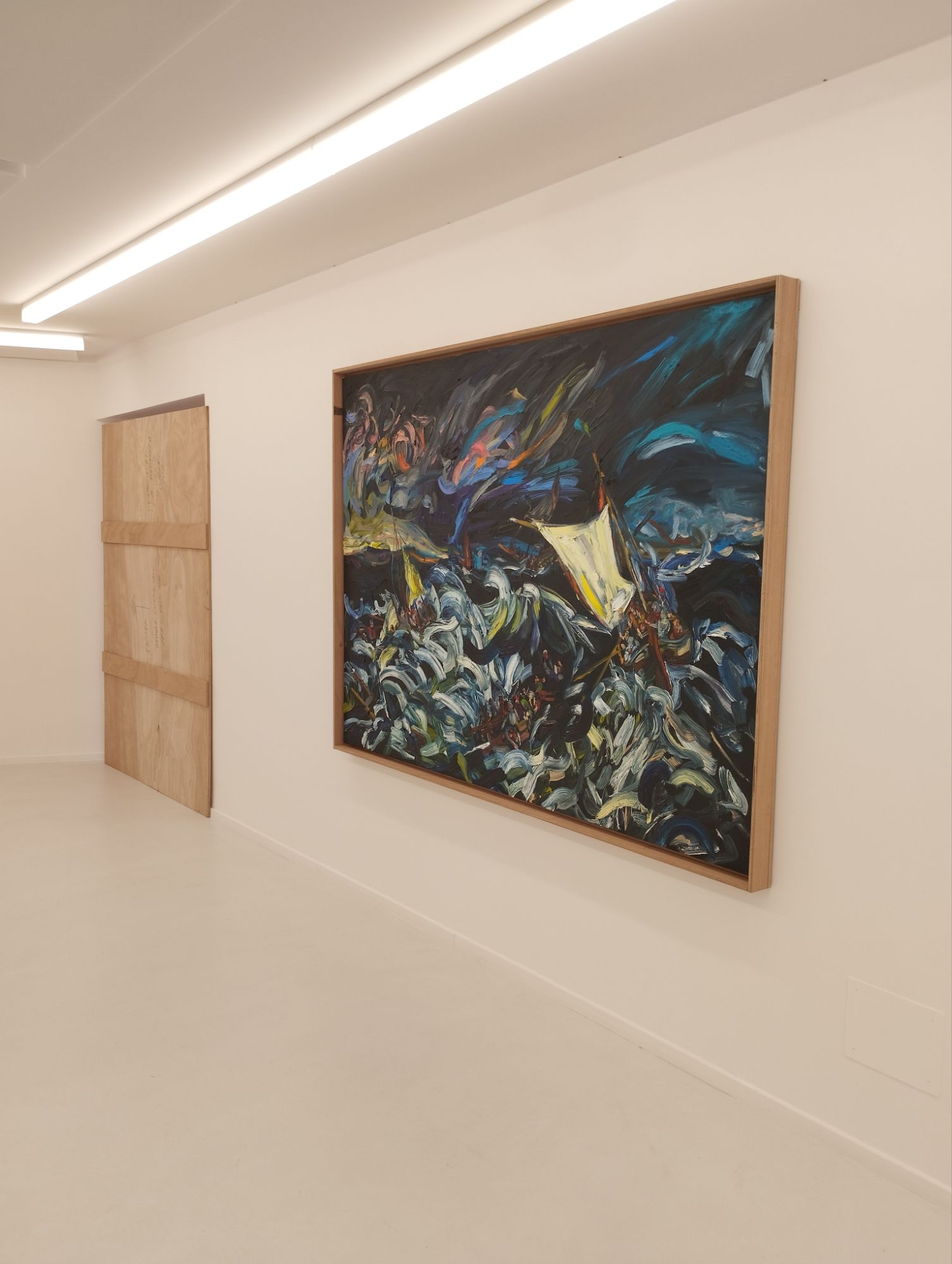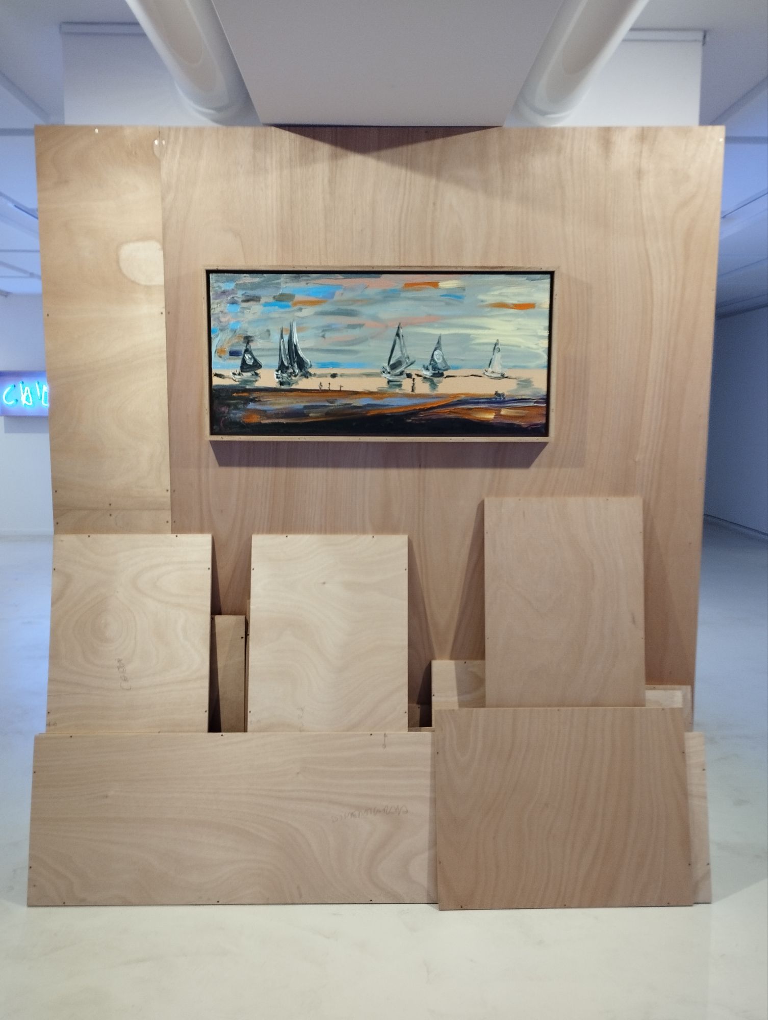 L’assurdo emerge nel porto canale di Pescara, proprio fuori dall’ambiente espositivo. Fato sembra raccontare l’interno di una nave attraverso barche e imbarcazioni: calma e irrequietezza convivono, creando spaesamento in un sistema che dovrebbe proteggere chi vi si trova dentro. Il potere del lavoro si manifesta nelle forme di scrittura, nelle persone e in chi ha influenzato il percorso dell’artista. La pittura contemporanea diventa rappresentazione di un caos dettato dalla politica attuale, capace di coinvolgerci e farci guardare la realtà.