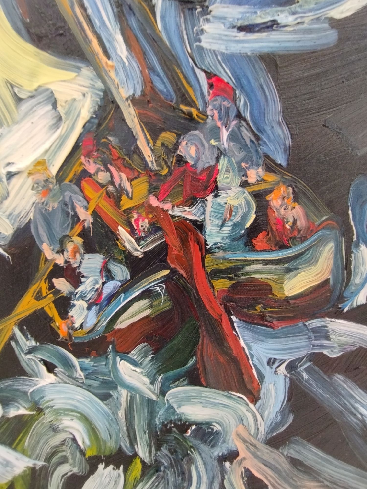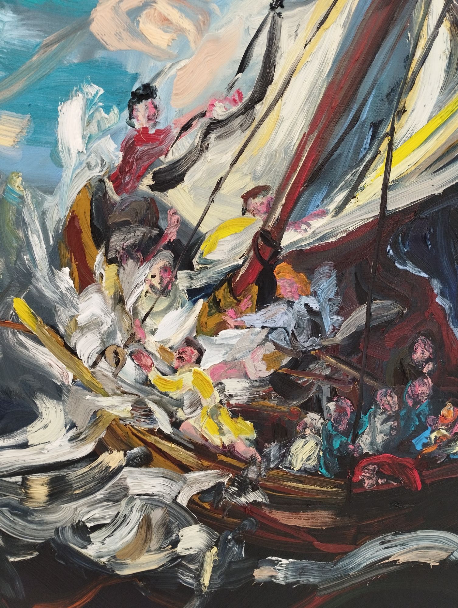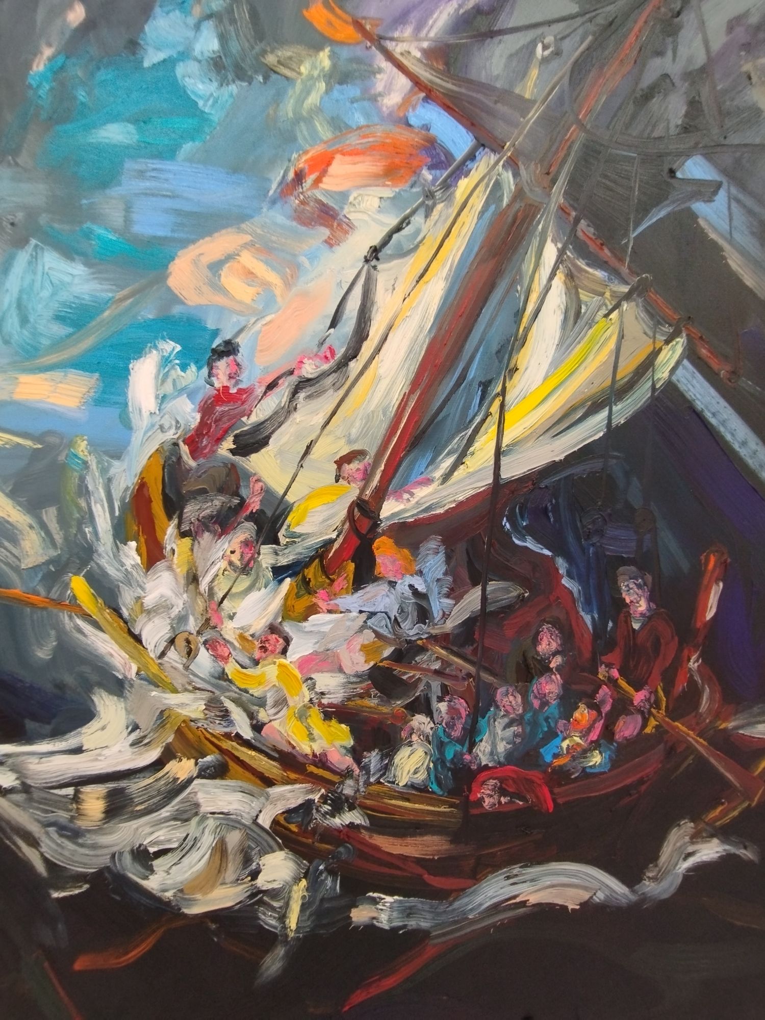 L’assurdo emerge nel porto canale di Pescara, proprio fuori dall’ambiente espositivo. Fato sembra raccontare l’interno di una nave attraverso barche e imbarcazioni: calma e irrequietezza convivono, creando spaesamento in un sistema che dovrebbe proteggere chi vi si trova dentro. Il potere del lavoro si manifesta nelle forme di scrittura, nelle persone e in chi ha influenzato il percorso dell’artista. La pittura contemporanea diventa rappresentazione di un caos dettato dalla politica attuale, capace di coinvolgerci e farci guardare la realtà.